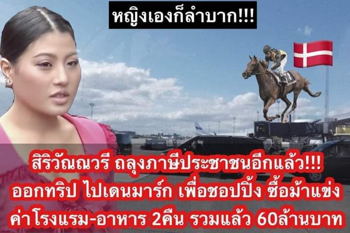 เจ้าหญิงไทย เสด็จชอปปิ้ง ไปหาซื้อม้าแข่ง ณ ประเทศเดนมาร์ก ค่าใช้จ่าย ค่ากินอยู่ ค่าเช่ารถ ทุกอย่างคือเงินภาษีประชาชนทั้งหมด (เบิกที่สถานทูตไทยในเดนมาร์ก) รอบนี้จ่ายไปทั้งหมด 50-60ล้านบาท