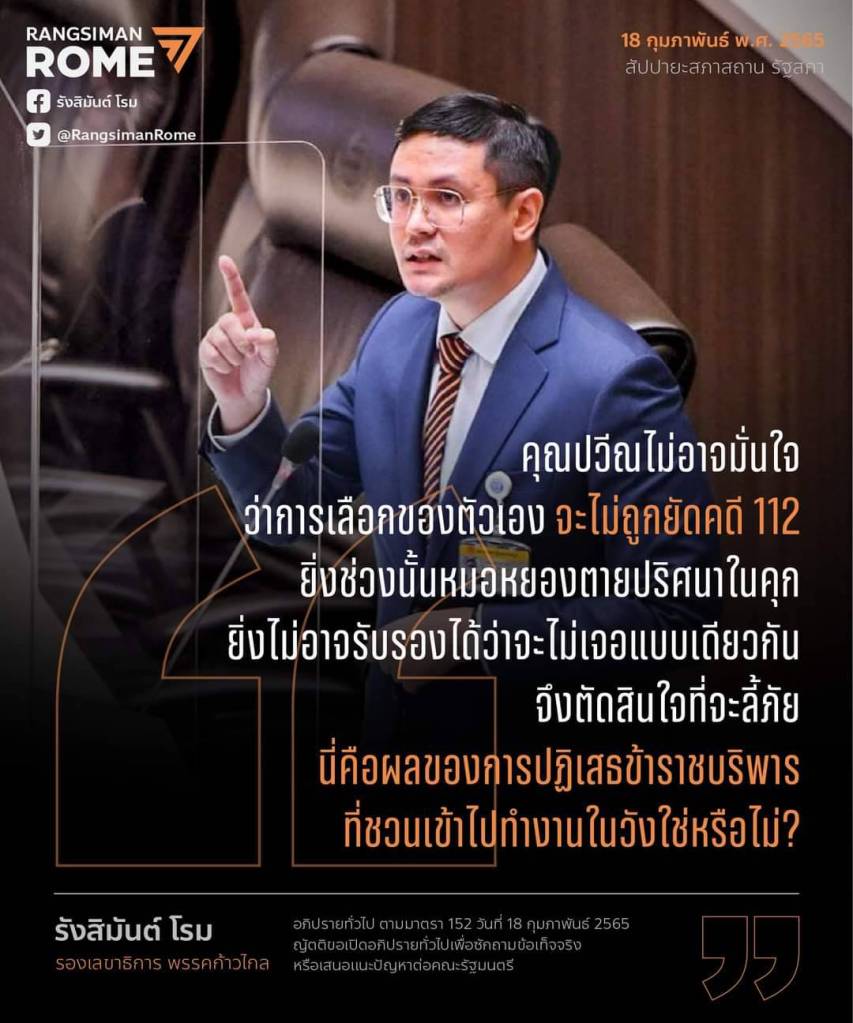 เมื่อสักครู่ที่ผ่านมา ผม รังสิมันต์ โรม ส.ส. พรรคก้าวไกล ได้อภิปรายทั่วไปโดยไม่มีการลงมติตามรัฐธรรมนูญมาตรา 152 ต่อรัฐบาล พล.อ.ประยุทธ์ จันทร์โอชา ในประเด็นเกี่ยวกับคดีการค้ามนุษย์ชาวโรฮิงญาเมื่อปี 2558 ที่นำทีมสืบสวนสอบสวนโดย พล.ต.ต.ปวีณ พงศ์สิรินทร์ ซึ่งตลอดกระบวนการได้ถูกขัดขวางข่มขู่โดยบุคคลต่างๆ ด้วยหลากหลายวิธีการ และต่อมายังถูกโยกย้ายในลักษณะที่เข้าข่ายเป็นการให้เสี่ยงอันตรายต่อชีวิต รวมถึงการเข้ามาเกี่ยวข้องของกลุ่มคนในแวดวงชนชั้นสูง ที่นำไปสู่การลี้ภัยของ พล.ต.ต.ปวีณในที่สุด ขอเชิญอ่านเนื้อหาคำอภิปรายทั้งหมดได้ที่นี่ครับ