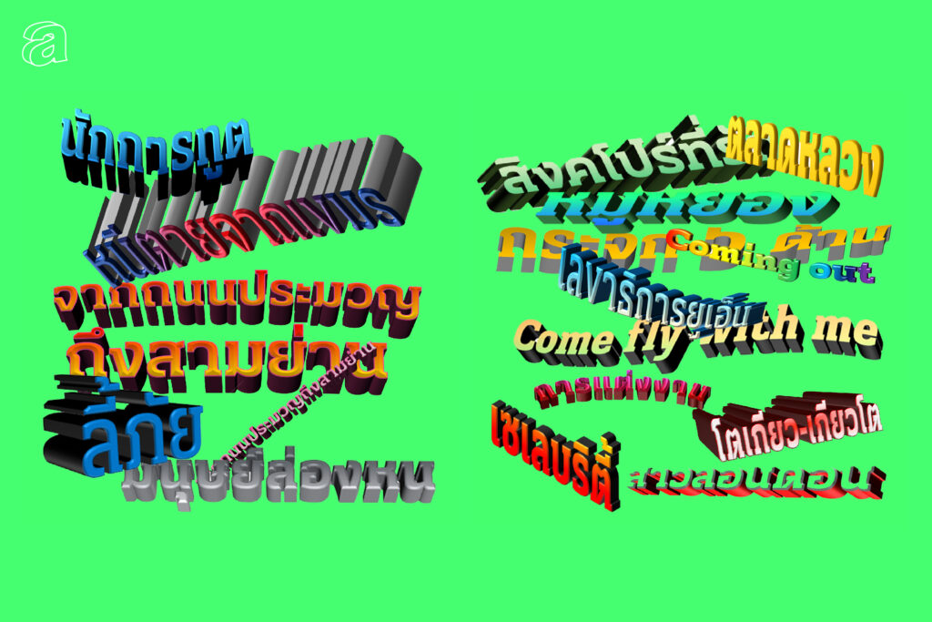 แต่ทางบรรณาธิการก็ยืนยันว่าอยากให้มีชื่อเรื่องบนปก ซึ่งทางทีมออกแบบก็เข้าใจเหตุผลดี เพราะเวลาสั่งหนังสือทางออนไลน์ ภาพใน thumbnail ก็เล็กอยู่แล้ว ถ้าไม่มีชื่อเรื่องอีกอาจจะดูโหดร้ายไป มันก็จะเป็นหน้าโล่งๆ เกลี้ยงๆ ซึ่งไม่สื่อสารกับคน หรือเวลาคนไปซื้อที่ร้านก็อาจจะบอกคนขายยากอีก เช่น “เอาเล่มนั้นน่ะ ที่เป็นหน้าคนไม่มีหน้า” สุดท้ายจึงเป็นการประนีประนอมกันและออกมาเป็นแบบที่เห็น ตัว lettering รอบแรกๆ ที่ทำขึ้นมาประกอบในหน้าหนังสือLettering ตัวอักษรที่ custom ขึ้นมาในการออกแบบระยะแรกที่ไปในทาง anti-design ตั้งใจทำให้ดูไม่เหมาะกับรสนิยมทางด้านกราฟิกที่ว่ากันว่าดี พัฒนามาจากคำว่ามนุษย์ต่างด้าว และมนุษย์ต่างดาว ลองเอาดาวทรงกลมมาจัดเรียงกันเป็นตัวอักษรตามที่เห็น นำไปใช้บ้างในบางส่วนของ layout