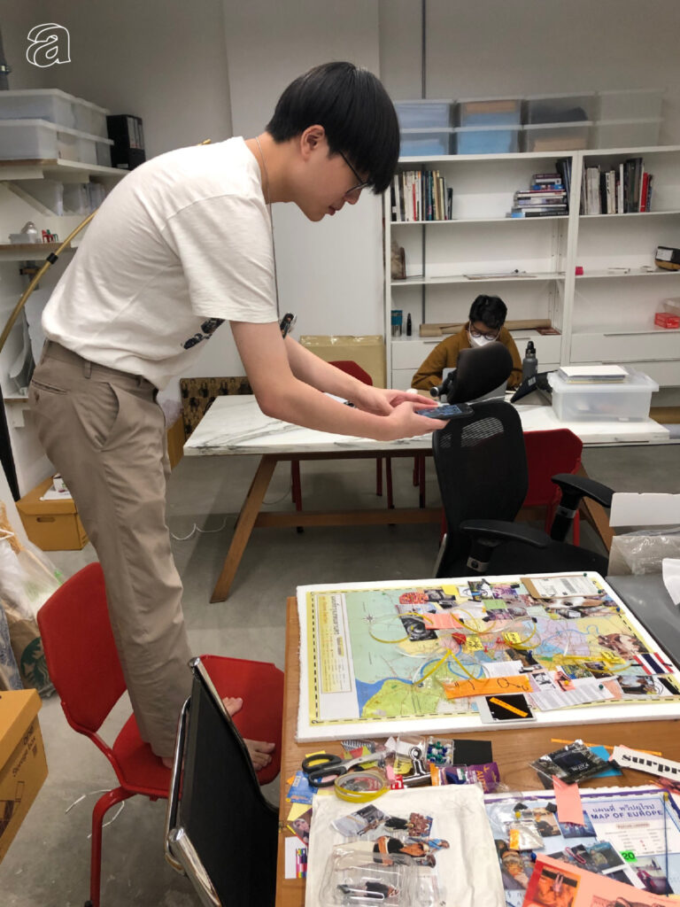แต่ปรากฏว่าน้องคนหนึ่งในทีมทำบอร์ดแบบนี้ขึ้นมาจริงๆ โดยเอาบอร์ดติดกับผนังบ้านแล้วถ่ายรูปมาให้ดู ทีมจึงคิดว่าทำจริงเลยดีกว่า แล้วสั่งซื้อแผนที่ที่ตั้งใจเอามาเป็นแบ็กกราวนด์และโครงเรื่องหลักของภาพประกอบที่จะใช้ในหนังสือเล่มนี้ ทั้งแผนที่โลก แผนที่ยุโรป และแผนที่กรุงเทพฯ จากร้านเครื่องเขียนออนไลน์ โดยกะว่าจะทำหนึ่งบอร์ดสำหรับแต่ละภาคในเล่ม และใช้วิธีถ่ายรูปแบบ zoom in, zoom out, crop, close up เป็นภาพเปิดในแต่ละบท แล้วพรินต์รูปที่ได้จากปวินมา mapping ลงตามจุดต่างๆ ในสเกลที่ถูกย่อลงมาเพื่อให้ภาพเกือบทุกภาพสามารถติดลงไปบนแผนที่ตามโลเกชั่นต่างๆ ที่ผู้เขียนบรรยายไว้ในเรื่องได้