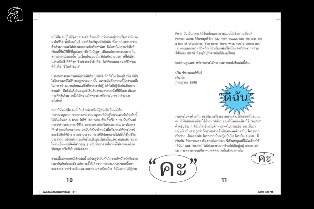 ที่เลือกวิธีนี้ก็เพราะต้องการที่จะสะท้อนบางอย่างของความเป็นปวิน นั่นคือ การไม่จำเป็นต้องทำแบบที่คนเขาว่าว่าดี หรือการตั้งคำถามกับสิ่งที่เชื่อต่อๆ กันมา สุดท้ายได้รับคอมเมนต์จากผู้เขียนว่า ดู childish หรือดูเด็กน้อยไป ทำให้ต้องรื้อแบบแล้วทำใหม่ เพราะคนอื่นก็อาจจะไม่เก็ตเหมือนกัน แต่ยังคงไว้ให้เป็นเท็กซ์ที่อ่านง่าย จะแอนตี้ดีไซน์ก็ได้แต่ไม่ต้องไร้เดียงสาขนาดนั้น